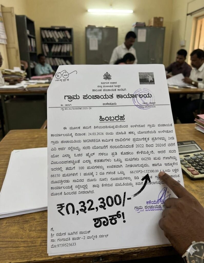 ಅರ್ಜಿದಾರರ ಮನವಿಗೆ ಉತ್ತರಿಸಿರುವ ಪಂಚಾಯತ್ ಅಭಿವೃದ್ಧಿ ಅಧಿಕಾರಿಗಳು, ನೀವು ಕೇಳಿರುವ ಮಾಹಿತಿ ಬರೋಬ್ಬರಿ 66,250 ಪುಟಗಳಷ್ಟಿದೆ ಎಂದು ತಿಳಿಸಿದ್ದಾರೆ. ಇದರಲ್ಲಿ 100 ಪುಟಗಳನ್ನು ಉಚಿತವಾಗಿ ನೀಡಿ, ಬಾಕಿ ಇರುವ 66,150 ಪುಟಗಳಿಗೆ ತಲಾ 2 ರೂಪಾಯಿಯಂತೆ ಒಟ್ಟು 1,32,300 ರೂ. (ಒಂದು ಲಕ್ಷದ ಮೂವತ್ತೆರಡು ಸಾವಿರದ ಮುನ್ನೂರು ರೂಪಾಯಿ) ಗಳನ್ನು ಡಿಡಿ (DD) ಮೂಲಕ ಪಾವತಿಸುವಂತೆ ಹಿಂಬರಹ ನೀಡಿದ್ದಾರೆ ಗಮನಾರ್ಹ ತಪ್ಪುಗಳು ಮತ್ತು ಆಡಳಿತ ವೈಫಲ್ಯ: ದಿನಾಂಕದ ಎಡವಟ್ಟು: ಅಧಿಕಾರಿಗಳು ನೀಡಿದ ಪತ್ರದಲ್ಲಿ ದಿನಾಂಕವನ್ನು 24-04-2026 ಎಂದು ನಮೂದಿಸಲಾಗಿದೆ (ಇನ್ನೂ ಆ ದಿನಾಂಕ ಬಂದೇ ಇಲ್ಲ ?) ಇದು ಅಧಿಕಾರಿಗಳ ಬೇಜವಾಬ್ದಾರಿತನಕ್ಕೆ ಸಾಕ್ಷಿಯಾಗಿದೆ
